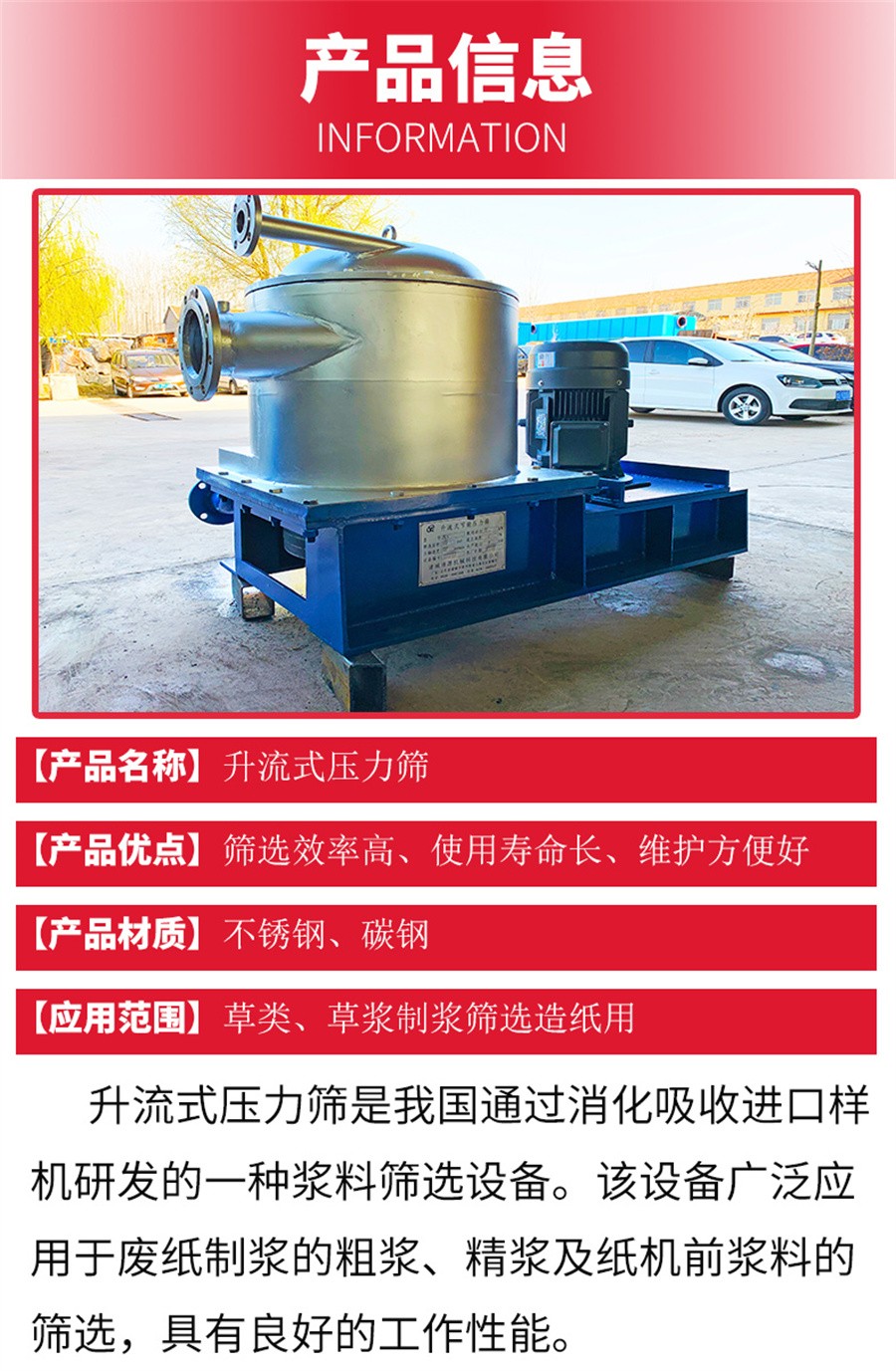 了年產二百多臺的輝煌成績。目前公司生產的壓力篩可用不銹鋼(304)和A3板兩種材料制作,精鑄304葉片和轉子,進出漿管路(漿料濃度)可選用自
