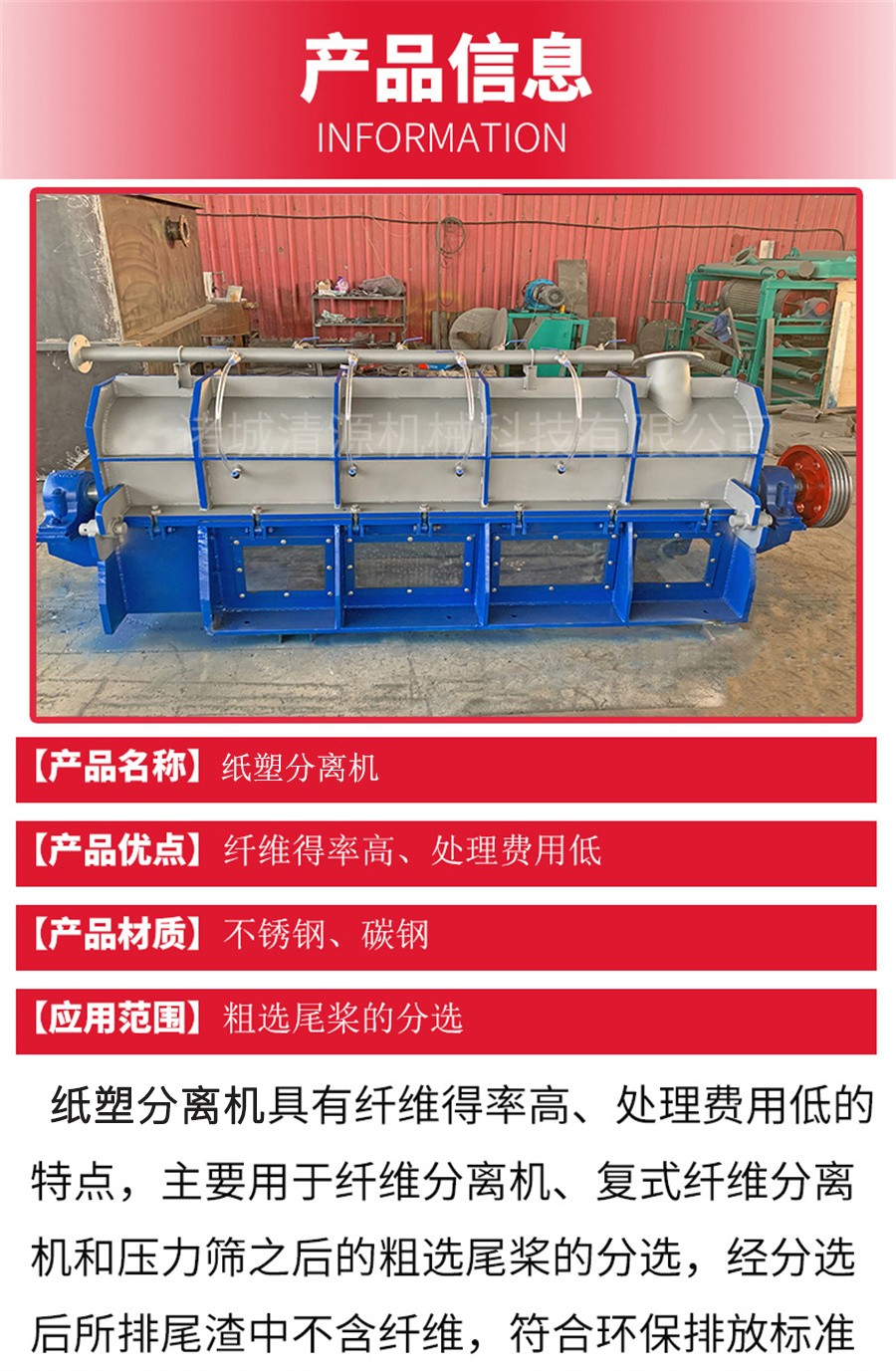 諸城清源機(jī)械生產(chǎn)的紙塑分離機(jī)包括一焊接的組裝主體,主體支撐著篩板、轉(zhuǎn)子、收集槽、渣滓排放槽和支架,它是水平安裝的。